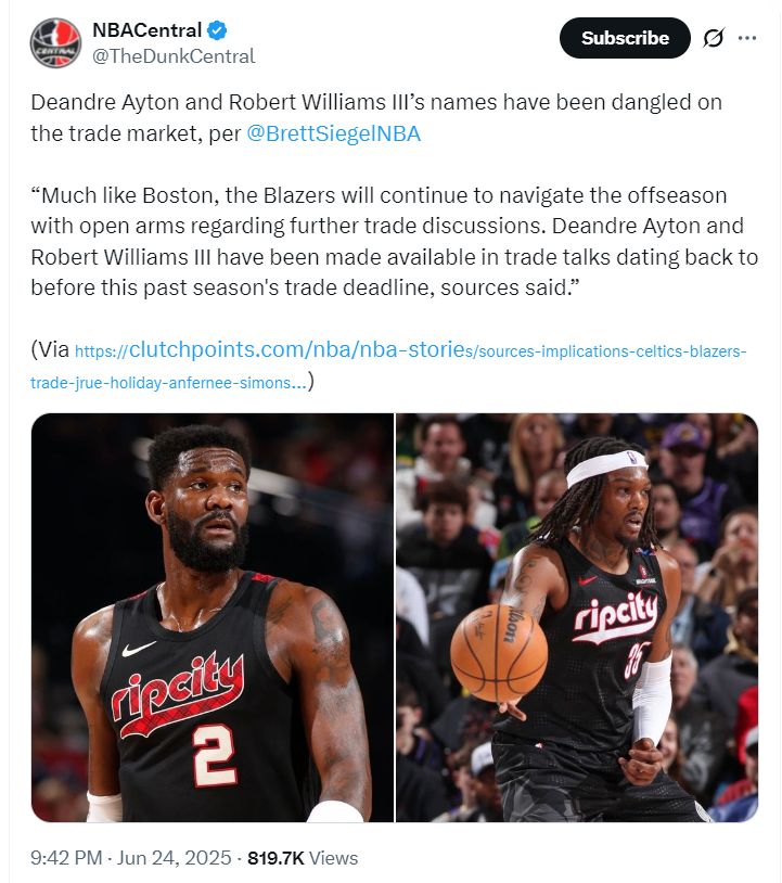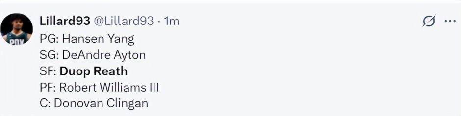 杨瀚森被开拓者选中后,开拓者有:德安德烈-艾顿、罗伯特-威廉姆斯、杜普-里斯、多诺万-克林特、杨瀚森五个中锋,注意这5人都是中锋不是PF/C摇摆人。