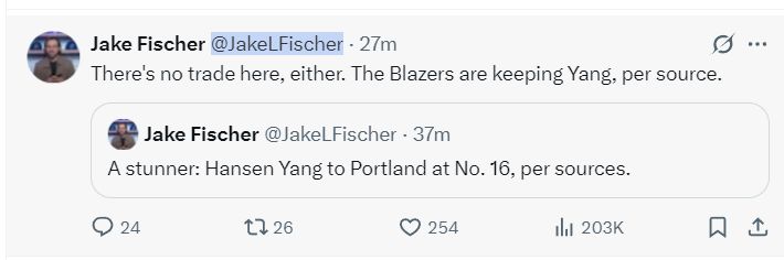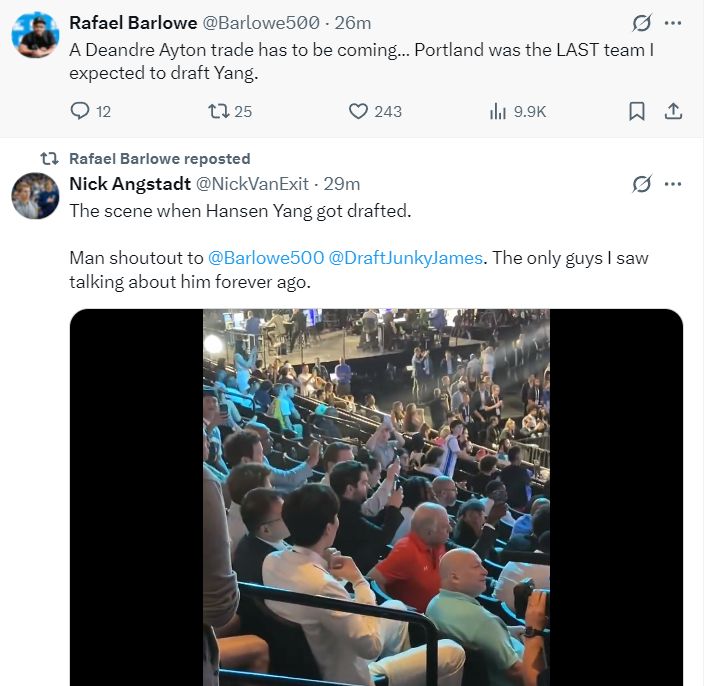 NBA选秀专家写道:开拓者在选中杨瀚森后,我感觉艾顿即将被交易走了。开拓者选杨瀚森是一个出乎意料的选择啊!