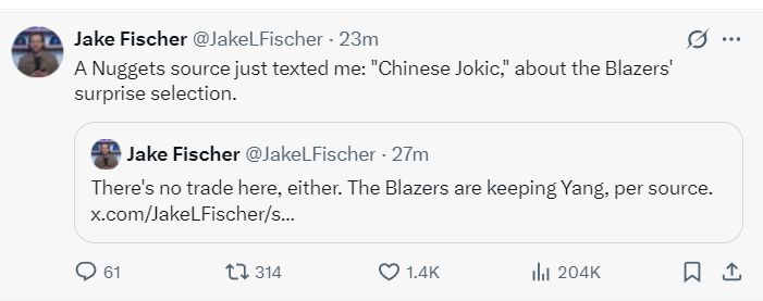 NBA记者杰克-费舍尔透露,开拓者打算留下杨瀚森,从我的消息源听说开拓者从掘金那里得到推荐,掘金管理层认为杨瀚森是中国版本的尼古拉-约基奇。