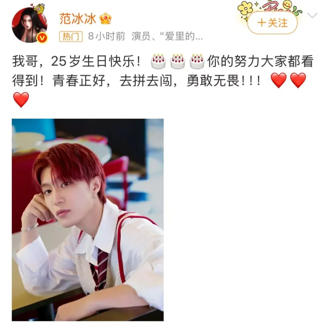 最近范丞丞过生日,九亿姐给他发了生日祝福,还喊范丞丞为“哥”,给足了他面子,跟着范丞丞也叫九亿姐“妹”,姐弟俩搞怪互动,看上去感情很不错。