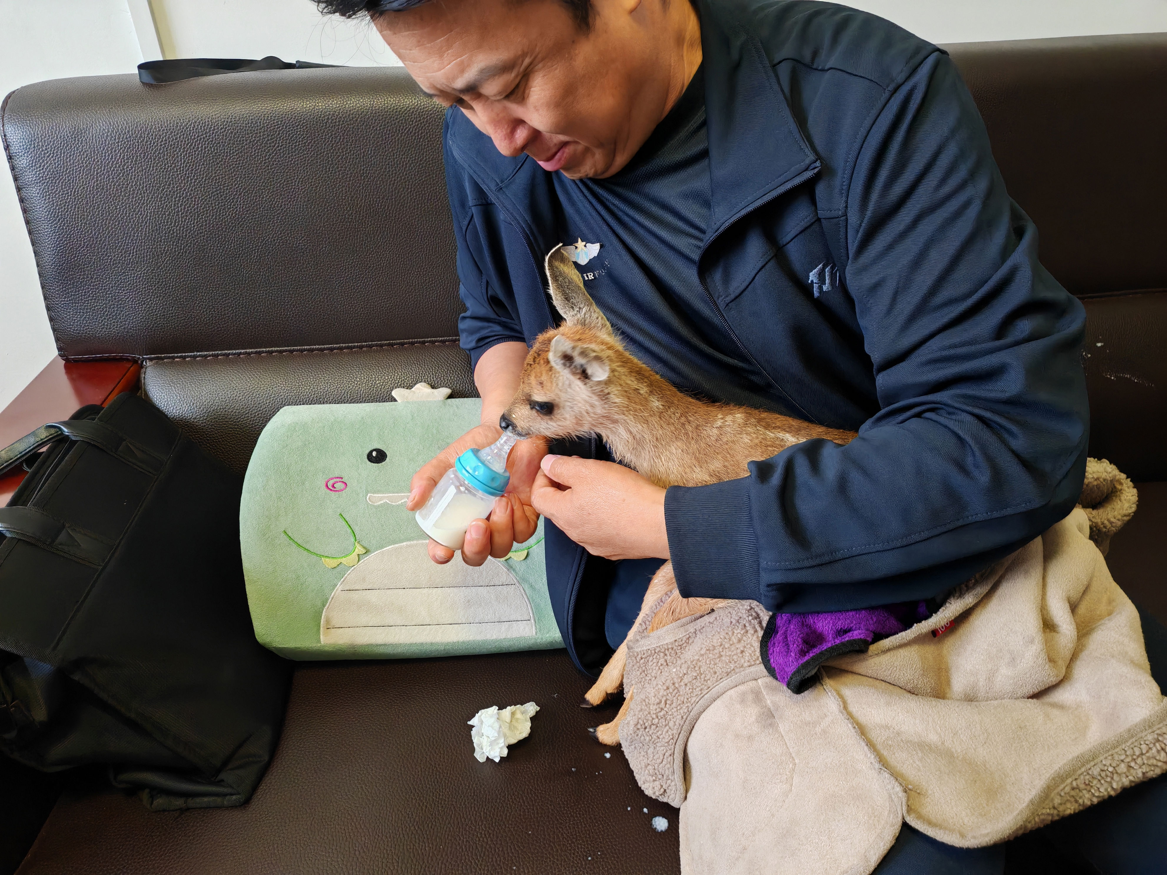 “这只梅花鹿幼崽的年龄大概有两个多月,被发现时后腿无法动弹、不断发出哀鸣,据我们推断,应该是受伤后和母鹿走散了。”灵台县林草中心副主任杨春回忆,接到护林员电话后,他们迅速赶赴现场,将幼鹿安全转移到灵台县林草中心。经过初步检查,他们发现该幼鹿左后腿存在软组织挫伤,并伴有严重的应激障碍。